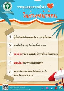 กรมการแพทย์ โดยสถาบันโรคทรวงอก แนะผู้ป่วยโรคหัวใจดูแลสุขภาพในช่วงหน้าร้อน หากพบมีอาการบ่งชี้ ให้รีบมาพบแพทย์ทันทีเพื่อป้องกันการเกิดภาวะหัวใจขาดเลือดหรือหัวใจวายเฉียบพลัน
